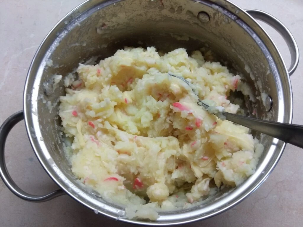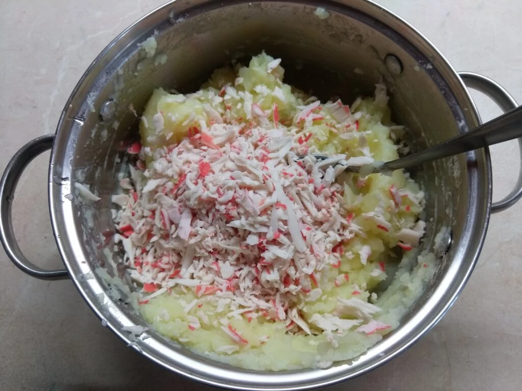- Крабовые палочки разморозить, натереть на крупной терке и добавить в пюре.