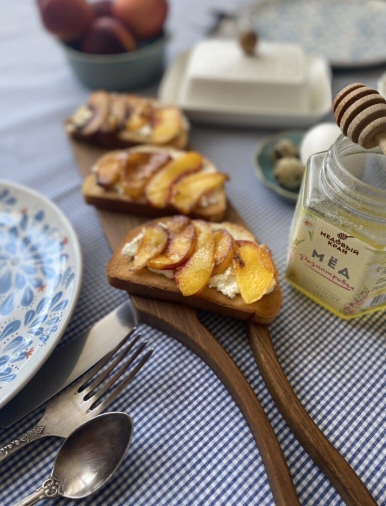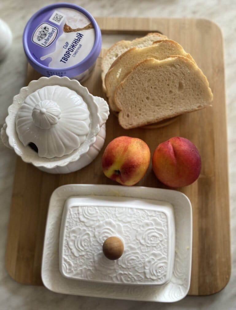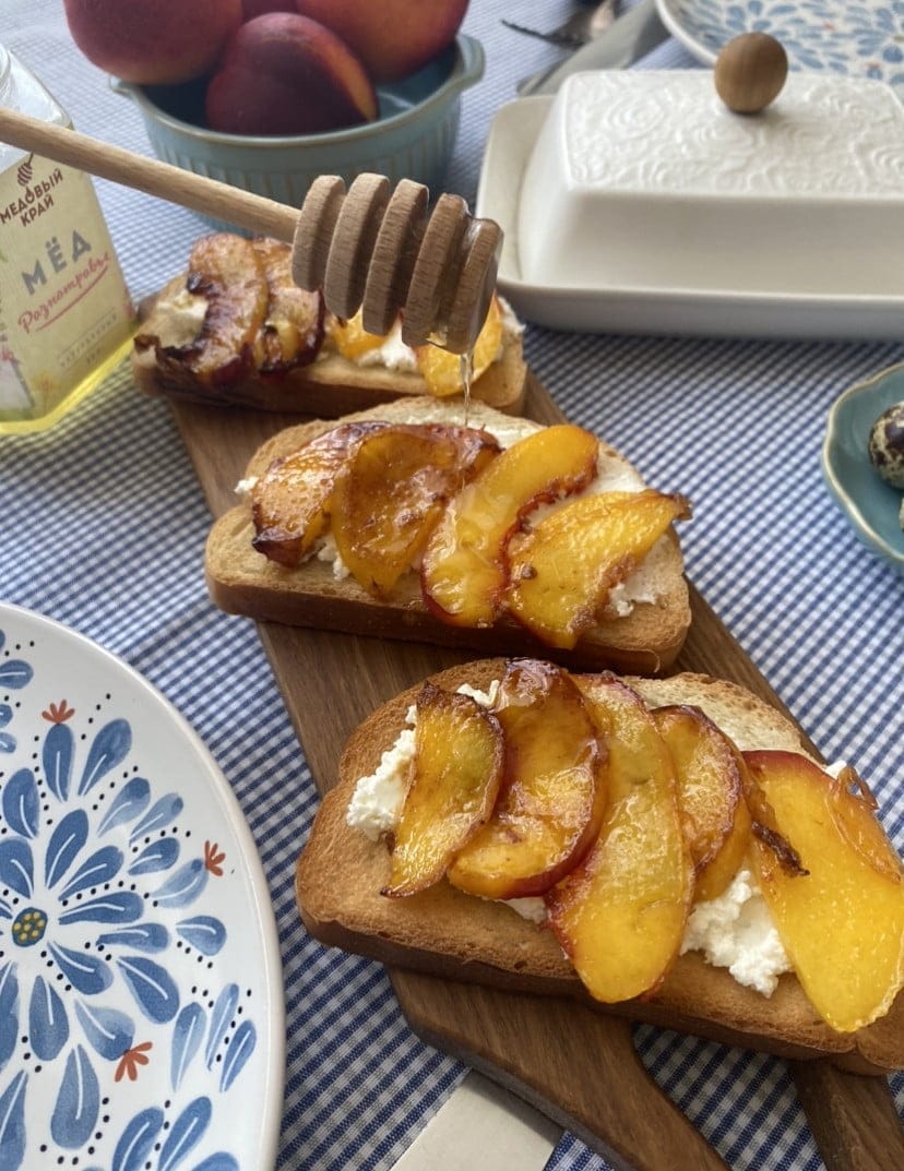 Тосты смажем творожным сыром и выложим на них персики.