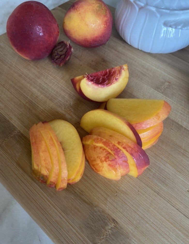 Персики разделим на половинки, удалим косточку и нарежем тонкими ломтиками.