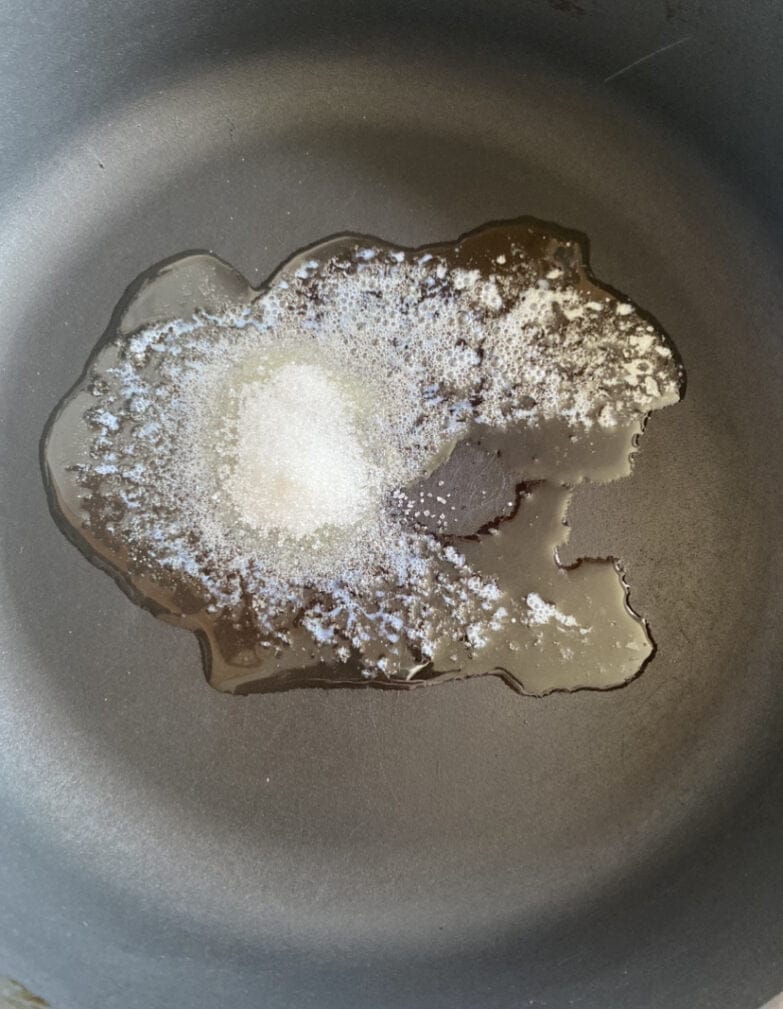 Масло расплавил на сковороде, добавим сахар. Обжариваем, тщательно перешивая, должна получиться карамельная масса.