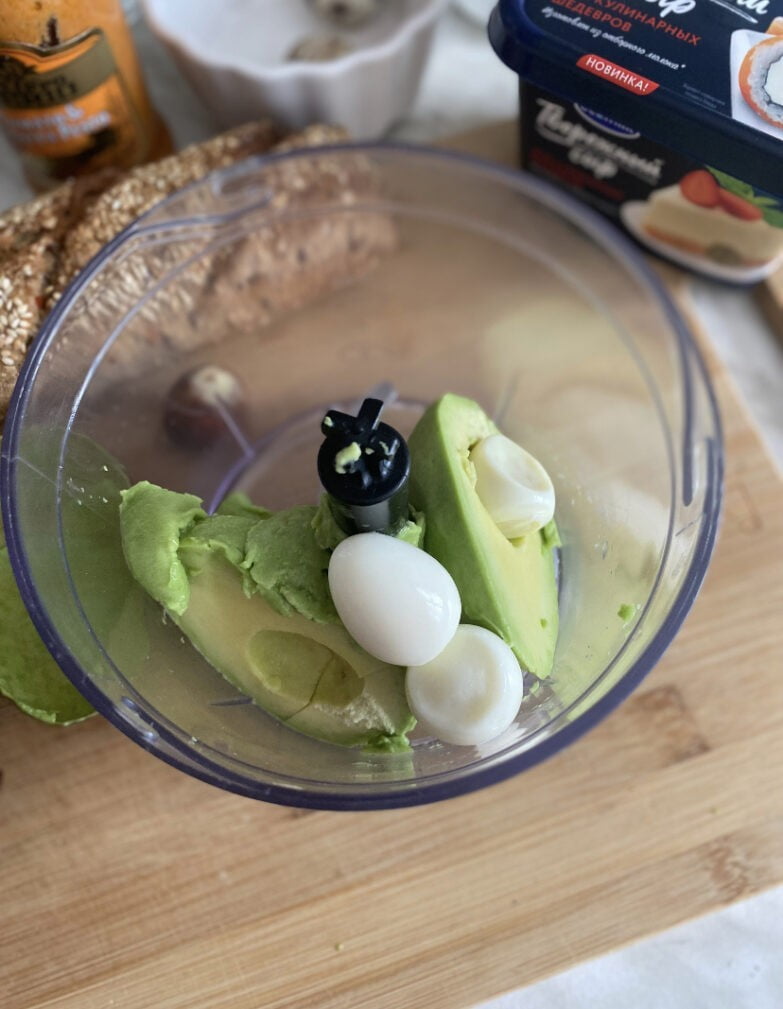 Яйца отварим и почистим, авокадо разрежем, удалим косточку, мякоть выжим в чашу блендера, добавим яйца, соль и тщательно пробьем до полной однородности.