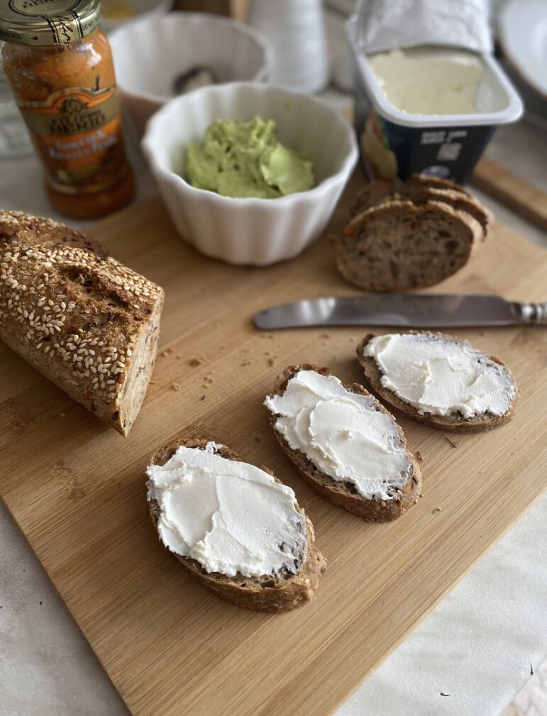 Багет слегка обжарим на сухой сковороде, намажем на хлеб творожный сыр