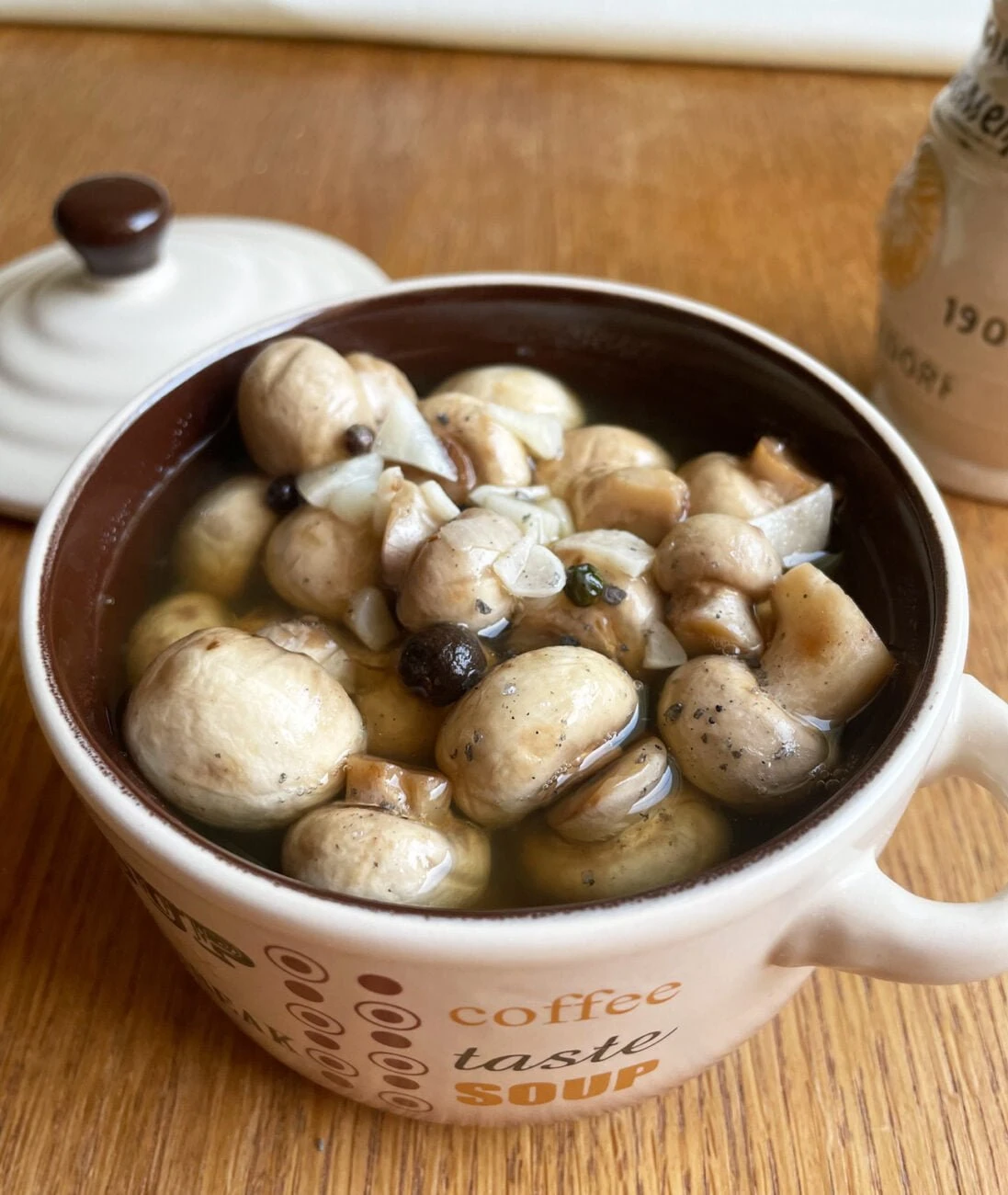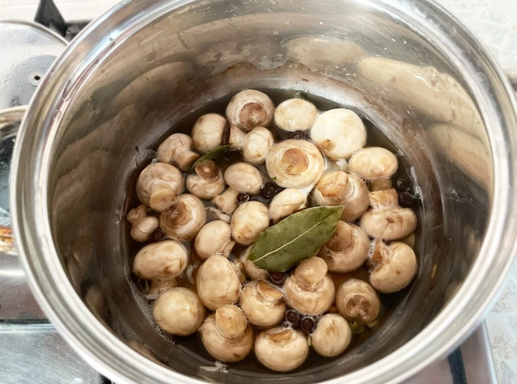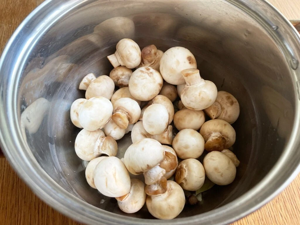 Поставьте кастрюльку с рассолом и грибами на слабый огонь и накройте крышкой. Варите шампиньоны 5 минут (больше не нужно, чтобы они оставались хрустящими). Грибы уменьшаться в размере и выделят жидкость (так что воды больше, чем указано не добавляйте).
