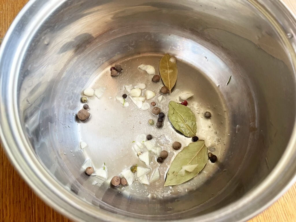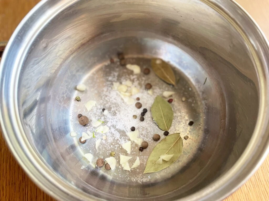 В кастрюлю всыпьте сахар, соль, забросьте перец душистый и перец горошком, лавровые листы и измельченный чесночок (его можно положить по вкусу).