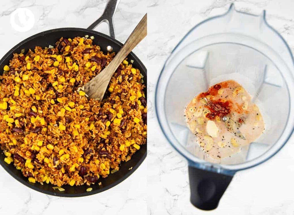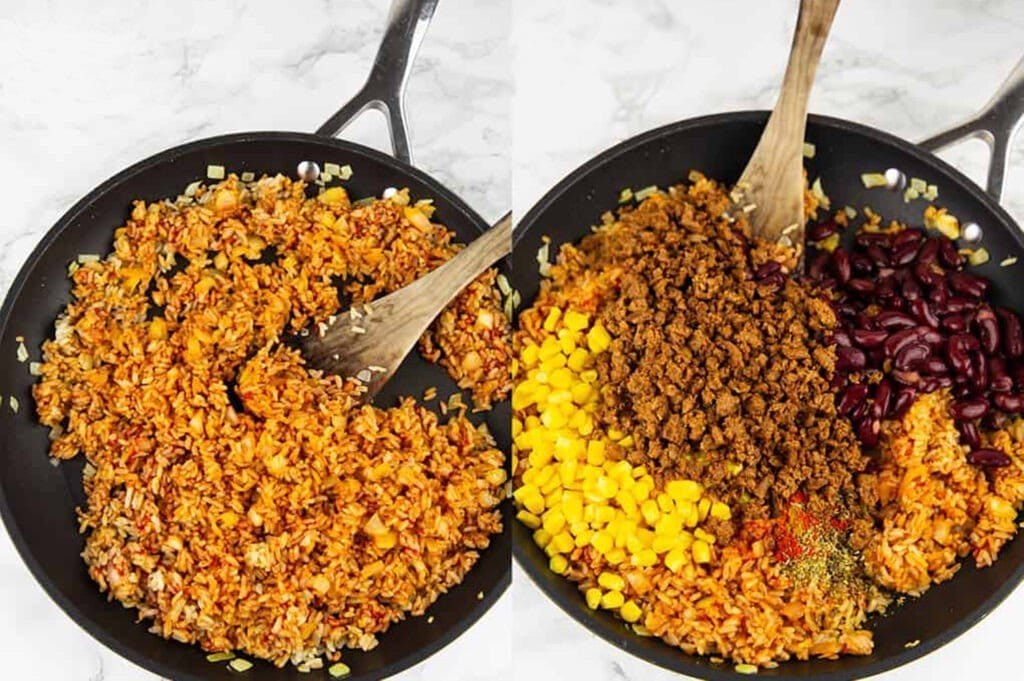 Затем добавьте приготовленный рис, томатную пасту и овощной бульон. Хорошо перемешайте и готовьте 3 минуты на среднем огне. Добавьте фасоль, кукурузу, обжаренный фарш и специи. Хорошо перемешайте и готовьте еще 3 минуты, пока не прогреется.