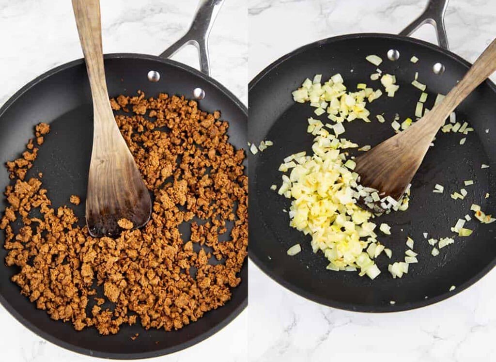 В той же сковороде нагрейте еще немного масла и обжарьте лук 2–3 минуты до прозрачности. Добавьте измельчённый чеснок и готовьте еще минуту.