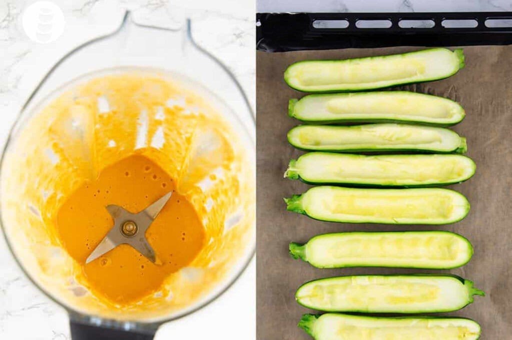 Разрежьте кабачки вдоль пополам и выньте мякоть ложкой. Затем застелите противень пергаментной бумагой, сверху выложите кабачки и слегка натрите их оливковым маслом.
