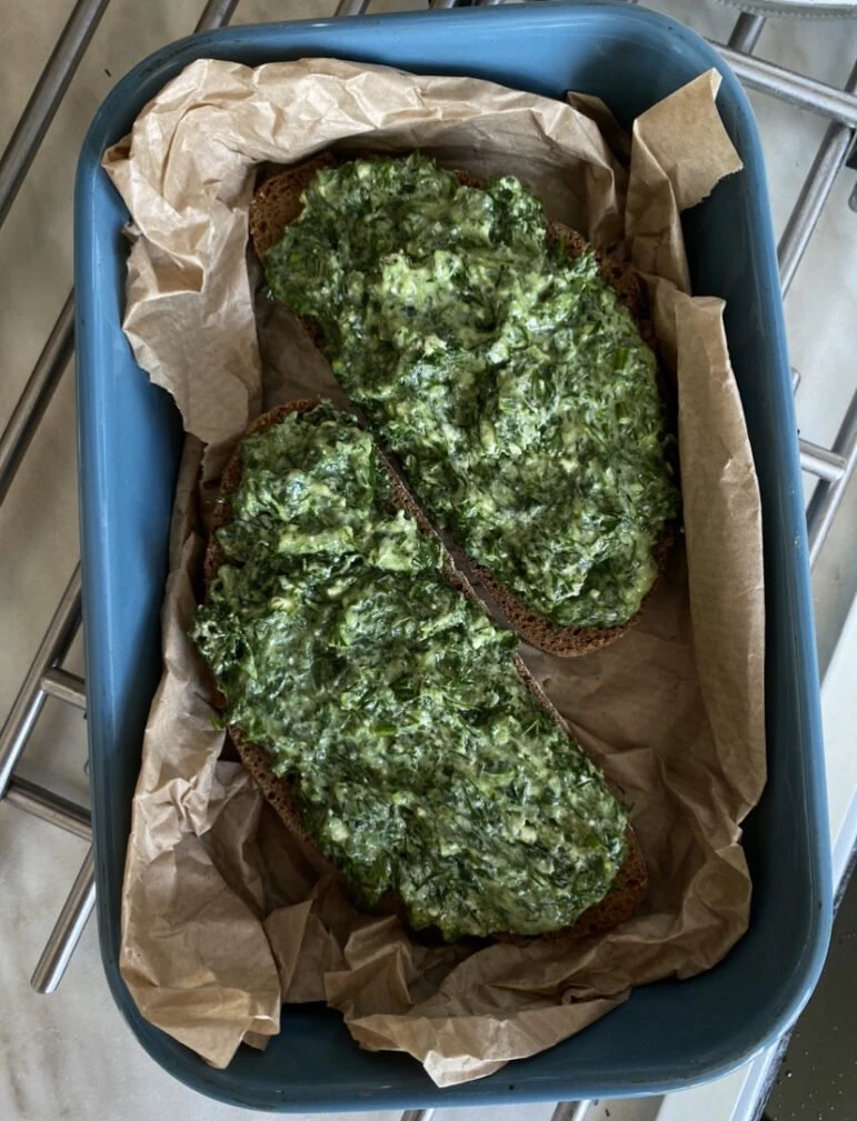 Идея максимально простая и полезная — шпинат на подсушенном гренке запекается в духовке! Все происходит быстро, максимально сохраняя вкус и пользу продуктов