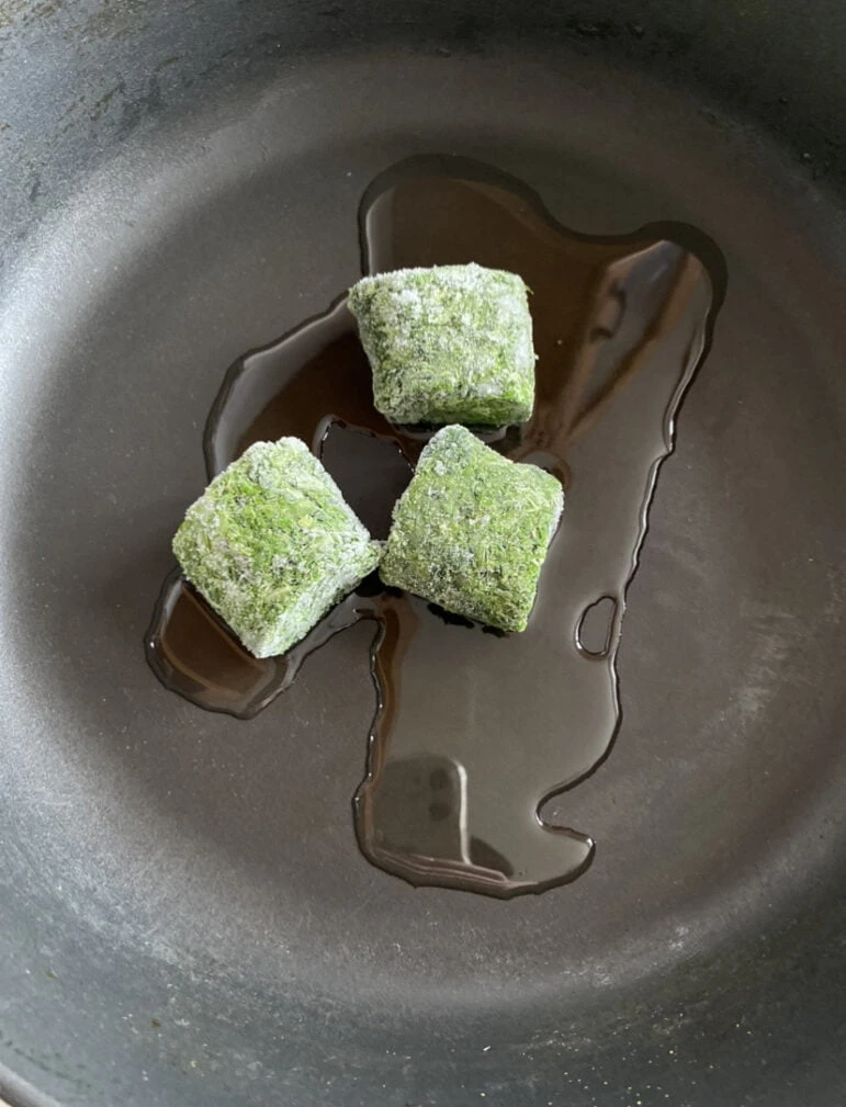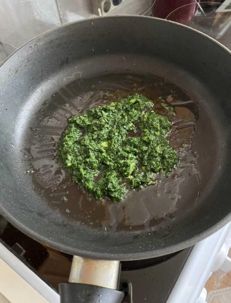Шарики шпината выложим на сковороду и протопим под закрытой крышкой до состояния однородности.