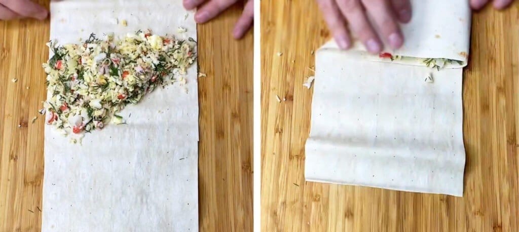 На край полоски выложить пару ложек начинки (в виде треугольника). Завернуть край лаваша, накрыв начинку. Продолжать скручивать, чтобы получился треугольник. Сделайте таким образом заготовки из всех полосок лаваша.