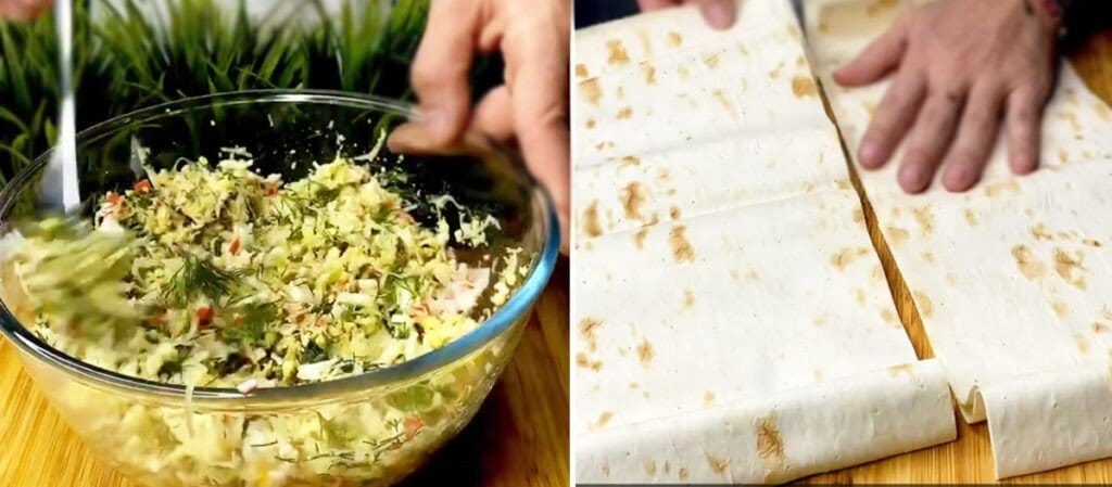 Лаваш разрезать пополам, чтобы получились длинные полоски.