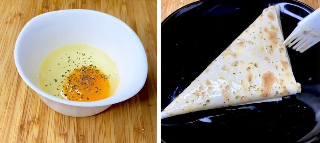 Взбейте яйцо, добавив немного сухого базилика. Смажьте треугольники из лаваша взбитым яйцом.