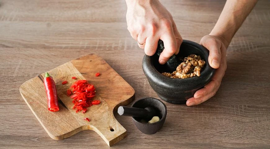 Грецкие орехи для лобио растолочь в ступке или пропустить через мясорубку. Стручковый перец нарезать тонкими колечками. Чеснок очистить и растолочь.