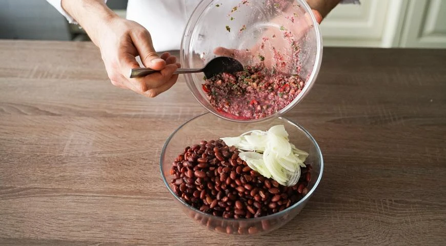 Приправить солью по вкусу. Лук очистить, нарезать тонкими полукольцами, добавить к горячей фасоли. Влить заправку и хорошо перемешать. Выложить лобио по-грузински на тарелку, посыпать зернами граната. Полезный совет