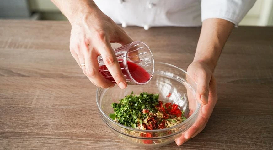 Зелень кинзы для лобио вымыть, обсушить и измельчить. Приготовить заправку: смешать в миске грецкие орехи, чеснок, кинзу, стручковый перец, все пряности и гранатовый сок.