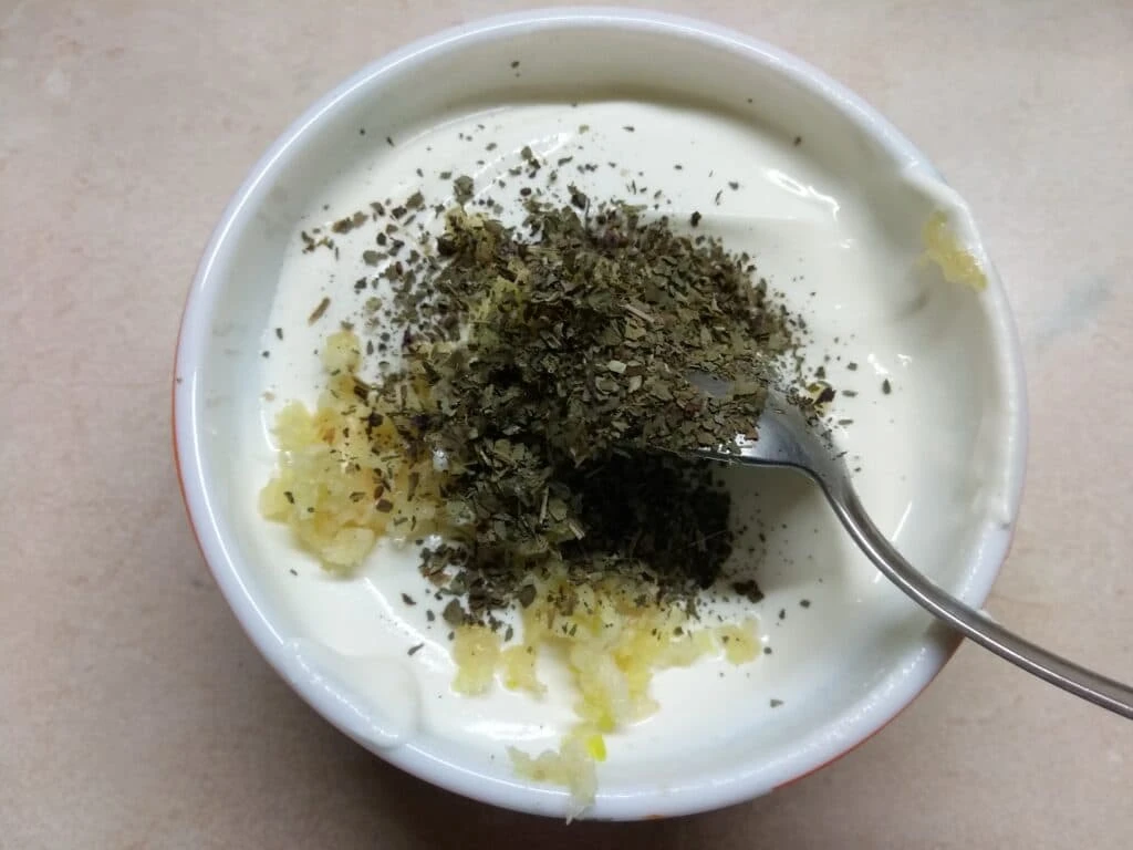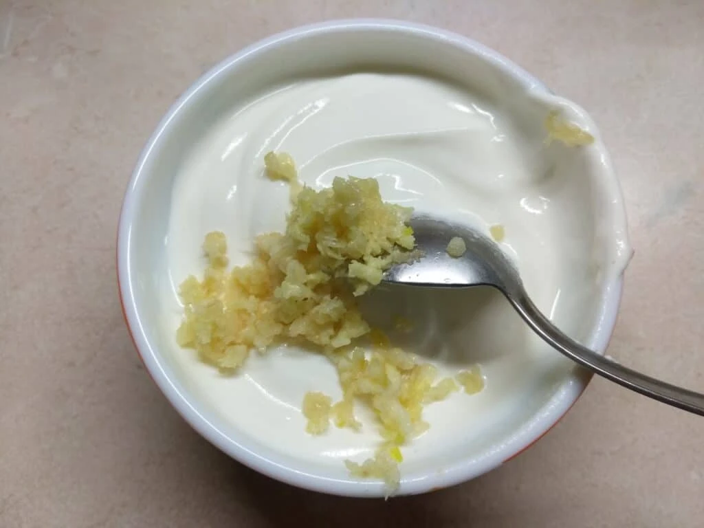 3. Чеснок помыть, очистить, выдавить через пресс прямо в сметану.