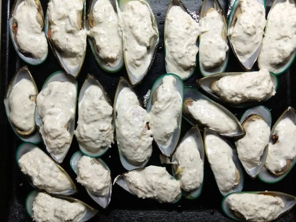 7. Влить в каждую мидию чесночно-сырный соус.