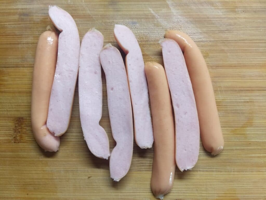 4. Вылить яйца на сковороду. Разложить равномерно половинки сосисок.