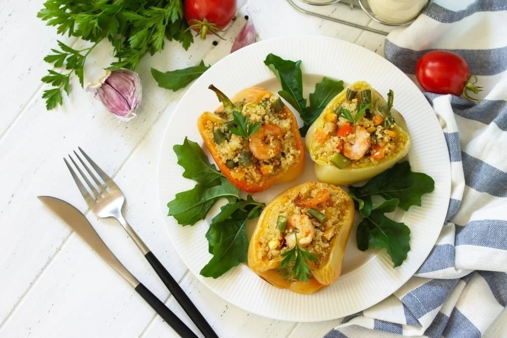 Перец можно готовить не только с мясным фаршем. Креветки в сочетании с крупой киноа, а также кукурузой, стручковой фасолью очень гармонично дополняют друг друга. В этом рецепте вместо традиционного риса используется крупа киноа. Это зерновая культура, которая по содержанию белка превосходит все другие злаки. В некоторых сортах — более 20%, кроме того, их состав близок к белкам молока. Также она не содержит глютена.