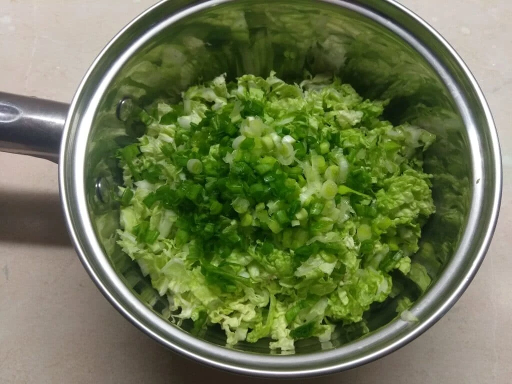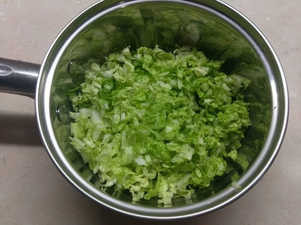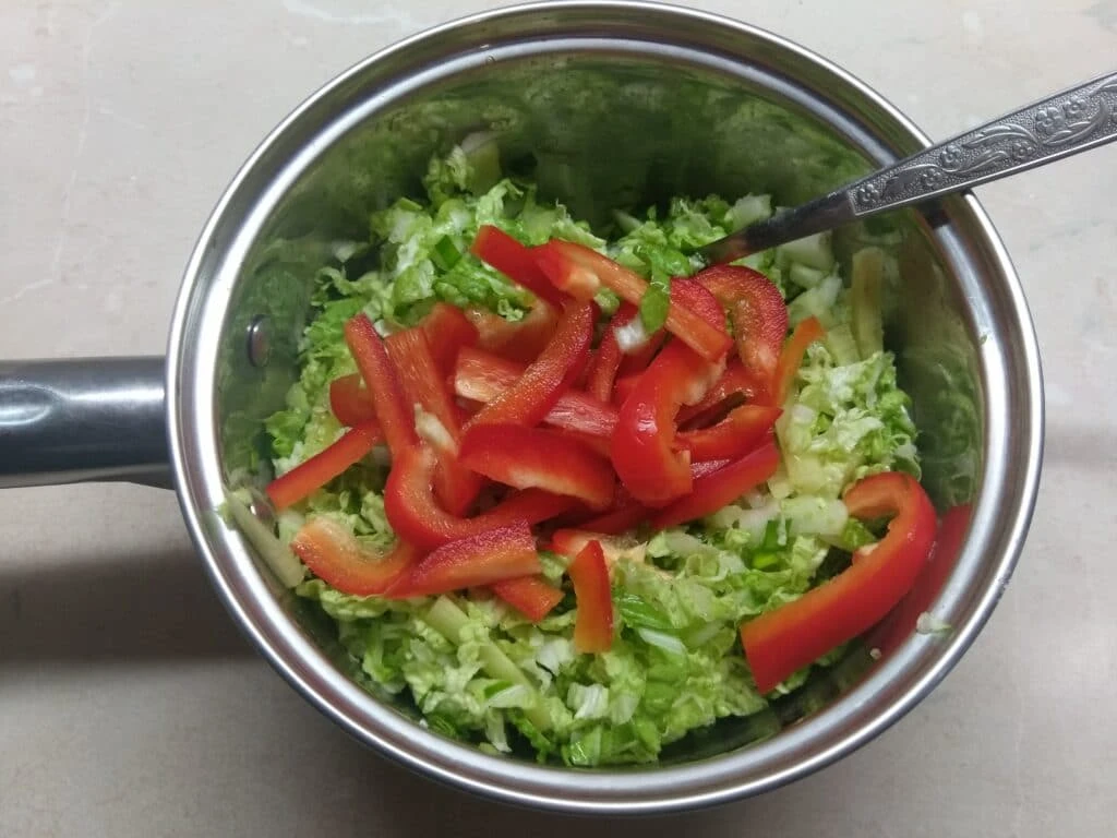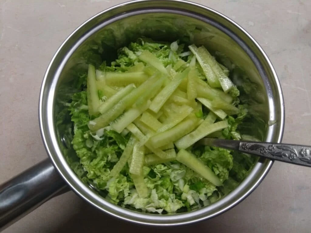 1. Пекинскую капусту помыть, нарезать соломкой. Сложить в кастрюлю.