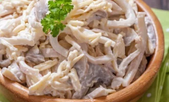 8. Куриную грудку нарезать ломтиками, выложить сверху на салат.