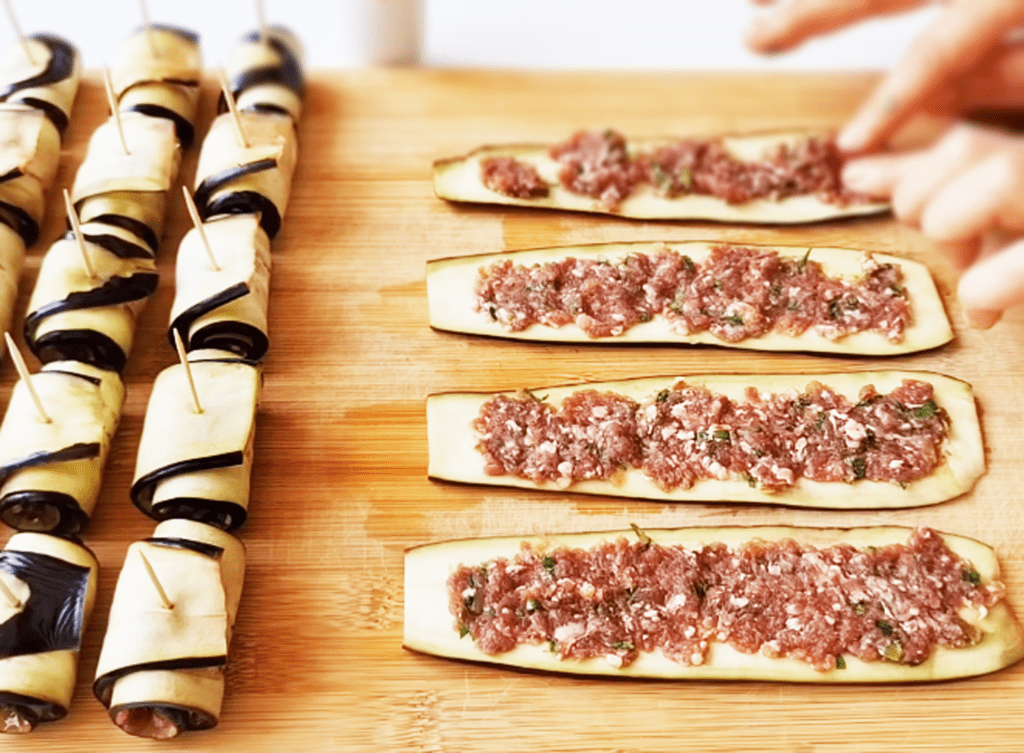 На полоски баклажанов выложить мясную начинку по всей длине. Свернуть полоски с фаршем рулетами и скрепить зубочистками.