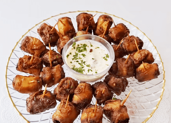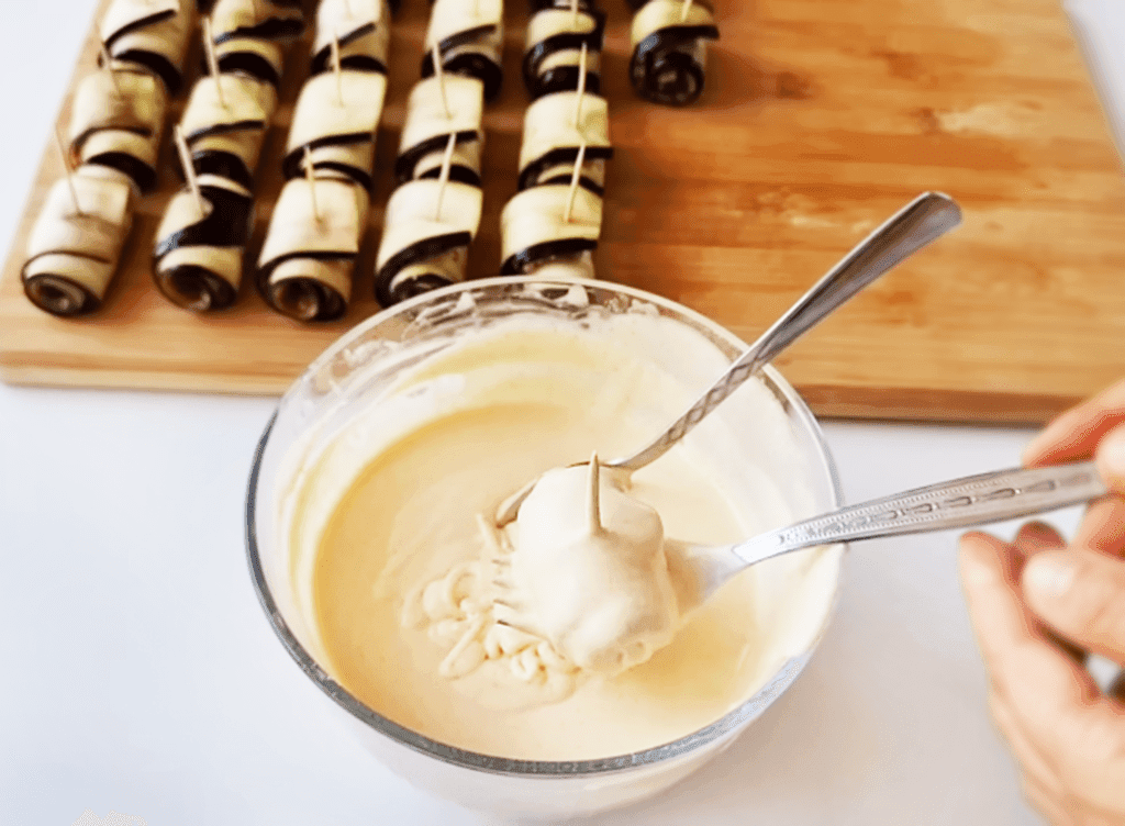 Подавайте рулетики из баклажанов в кляре тёплыми. Очень вкусно подавать с чесночным соусом.