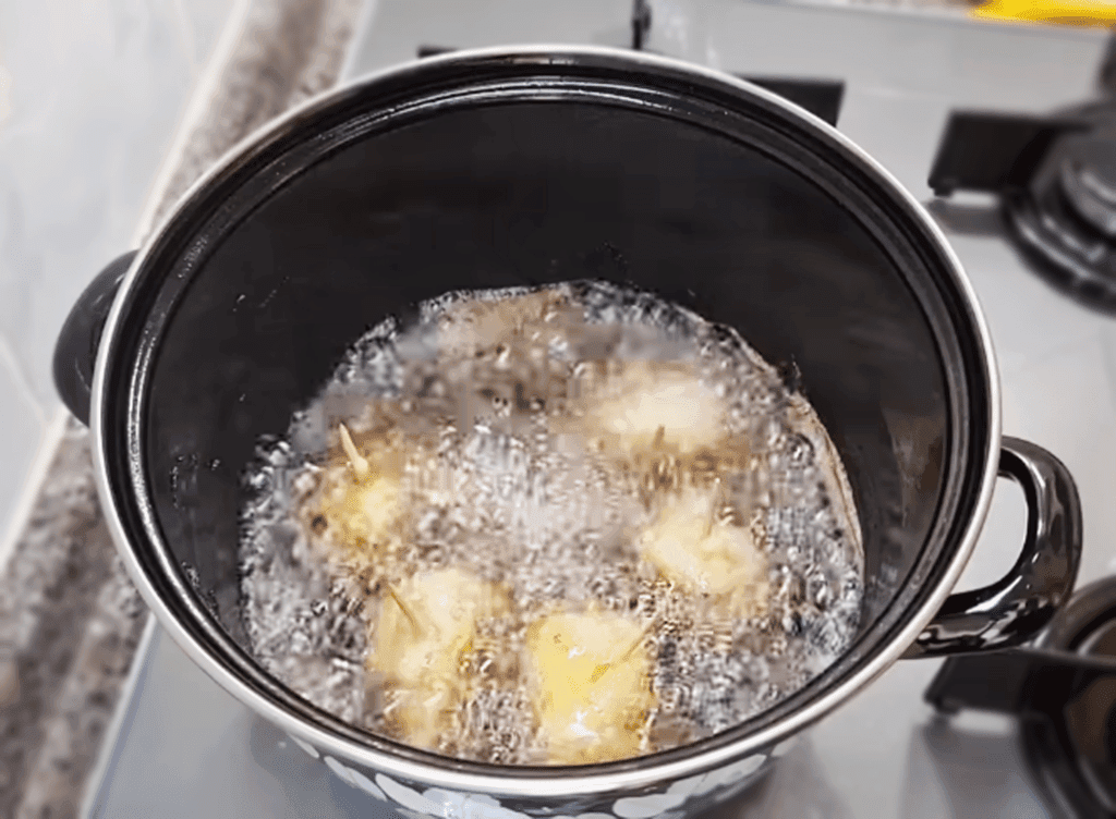 Подготовить кляр. Смешать сливки, яйца, специи. Добавить муку и перемешать, чтоб не было комочков. Хорошенько разогреть высокую посуду с маслом. Советую брать высокую, но узкую кастрюльку, так можно использовать меньше масла.