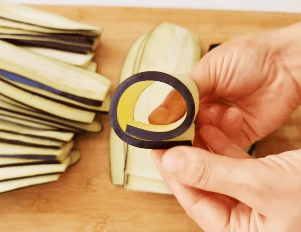 Баклажаны помыть, нарезать тонкими пластинами толщиной не более 0,5 см. Ломтик баклажана должен легко скручиваться рулетом.