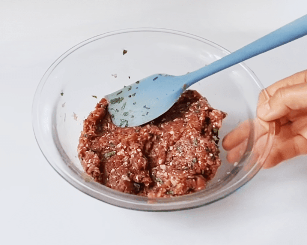 Небольшое количество фарша приправить специями. Также добавить измельченные лук и зелень, хорошенько перемешать.