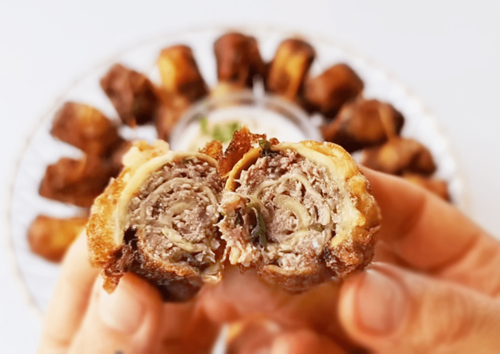Все привыкли готовить рулетики с сыром и орешками, но я предлагаю более сытную закуску с фаршем. Кстати, можно фарш заменить на паштет. Если хотите попикантней, добавьте в начинку мелко нарезанного острого красного перчика. Получается закуска на все случаи жизни 🙂