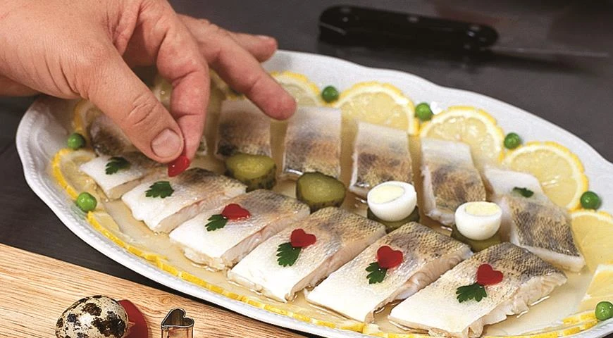 Зафиксируйте рыбу в этом положении, полив тремя половниками ланспика. Уберите в холодильник.
