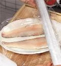 Застелите пленкой блюдо или большую тарелку. На нее кожей вниз положите филе. Посолите и поперчите, сверху накройте пленкой. Поставьте в духовку, разогретую до 100°С, и готовьте 1 ч. Рыбу остудите и поставьте в холодильник на 5 ч, а лучше на ночь.