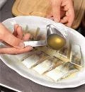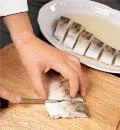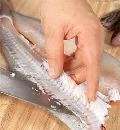 Очистите рыбу от чешуи, разрежьте брюшко и выпотрошите. Удалите жабры и спинной плавник, отрежьте голову. Выньте хребет и реберные кости. Удалите пинцетом оставшиеся косточки.