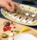 Лимоны нарежьте тонкими полукольцами. Из сладкого перца вырежьте сердечки при помощи формочки или нарежьте ромбами. Кружочки соленых огурцов используйте как подставки для половинок вареных яиц. Каждую деталь украшения сначала окунайте в ланспик, а потом выкладывайте на блюдо. Вылейте в заливное оставшийся ланспик и поставьте блюдо в холодильник. Выложите на яйца икру, украсьте горками желе.