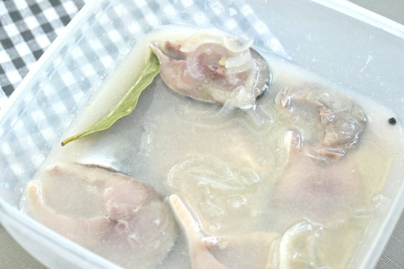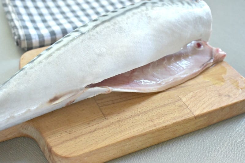 Со свежей скумбрии срезаем голову, хвост и плавники. Вспарываем брюшко, удаляем внутренности и обязательно избавляемся от чёрной плёночки внутри. Подготовленную скумбрию ополаскиваем под холодной водой.