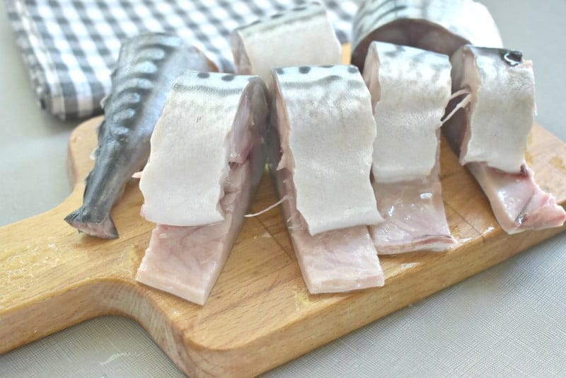 Нарезаем скумбрию кусочками толщиной примерно 2 см. Кусочки скумбрии перекладываем в подходящий контейнер.