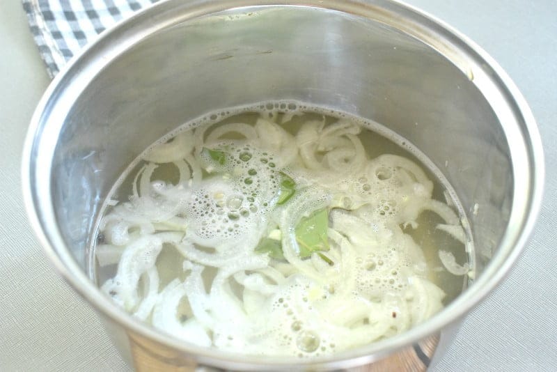 Приготовим маринад для скумбрии. В небольшую кастрюльку всыпаем сахар, соль, добавляем чёрный перец горошком и лавровый лист. Лук нарезаем тонкими полукольцами и добавляем к специям. Содержимое заливаем холодной водой, доводим до кипения, варим маринад 2-3 минуты.