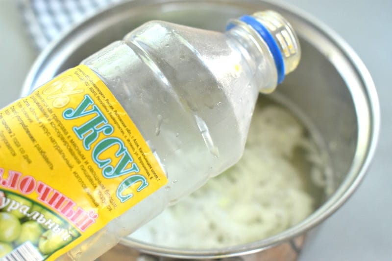 Выключаем огонь, вливаем в маринад яблочный уксус, перемешиваем и остужаем полностью.
