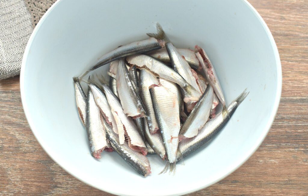 | 1 | Свежую кильку промываем, удаляем внутренности, срезая головы. Подготовленную рыбку складываем в миску. |