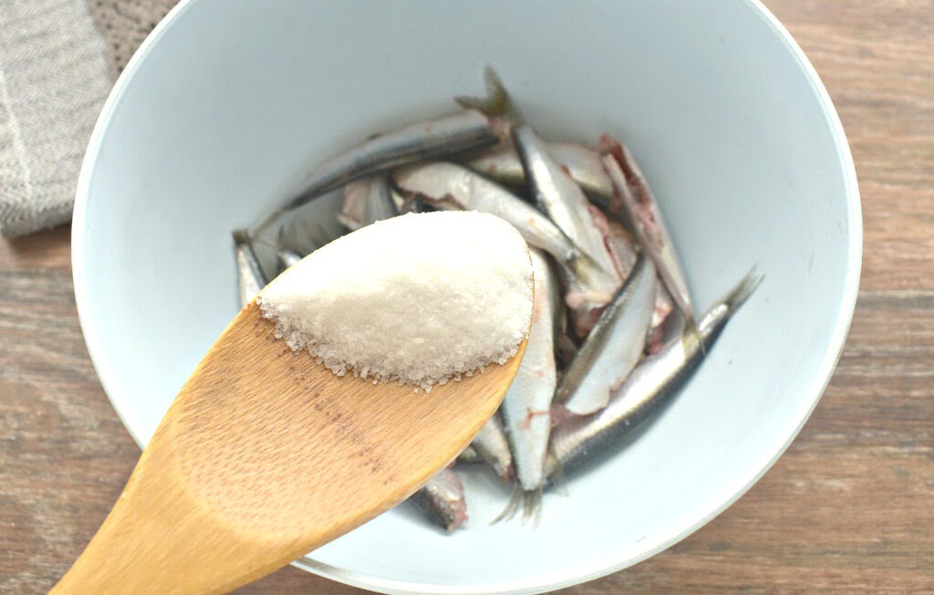 | 2 | Кильку засыпаем солью и перемешиваем. |