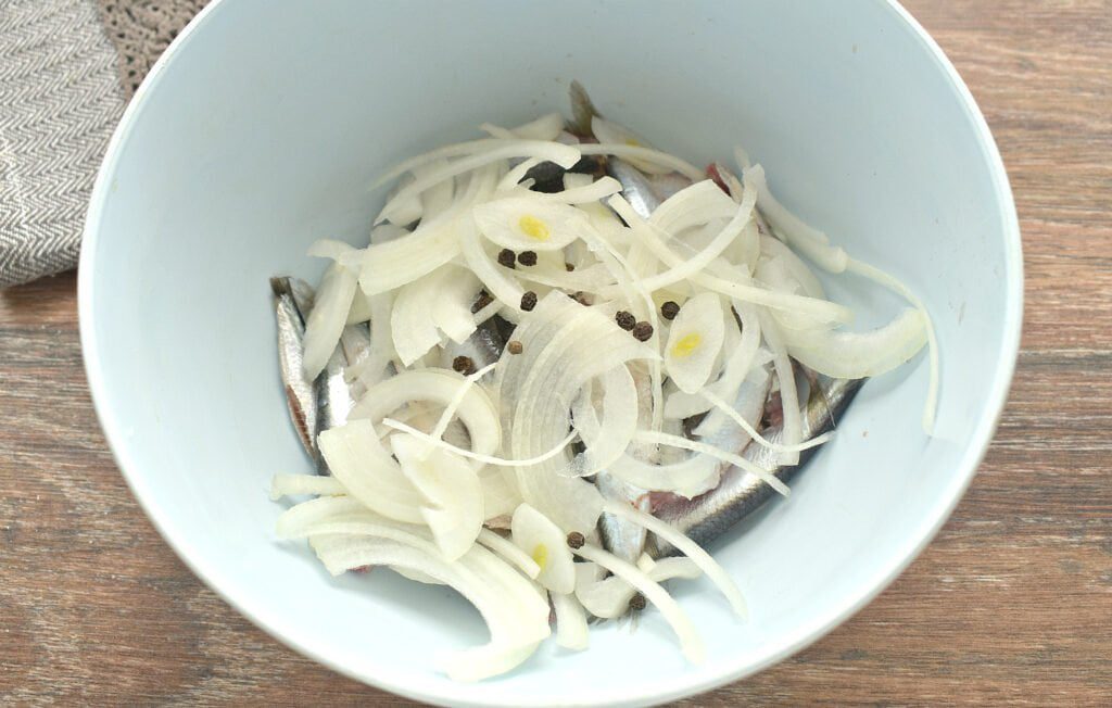 | 3 | Очищаем репчатый лук. Шинкуем его тонкими полукольцами. Луковую нарезку перекладываем к кильке. Всыпаем горошины перца. |