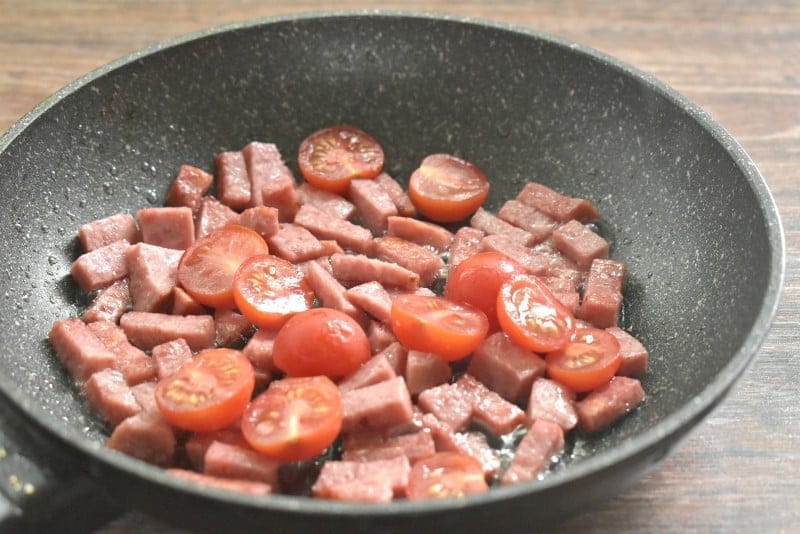 Помидоры черри промываем, разрезаем на 2 половинки. Добавляем черри к колбасе на сковороду. Перемешиваем, прогреваем 2 минуты.