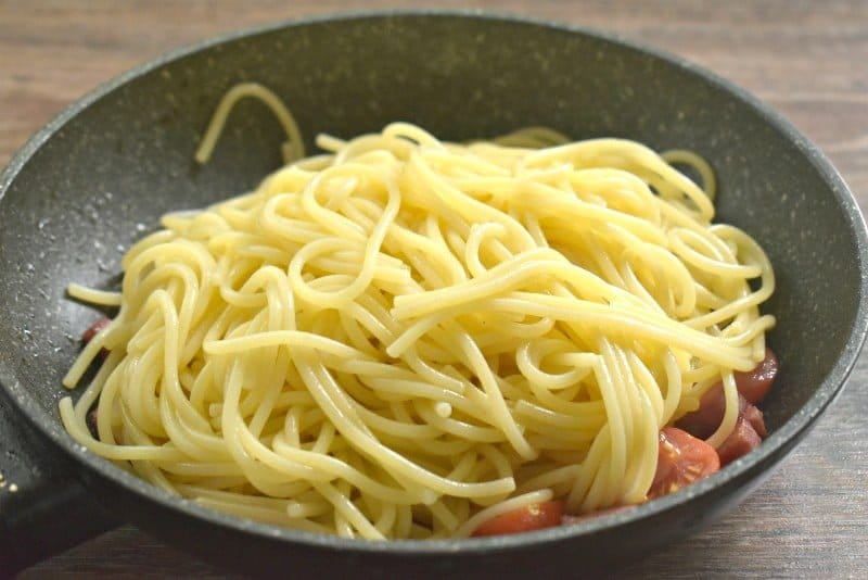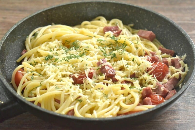Со спагетти сливаем воду, откинув на дуршлаг. Спагетти переправляем к колбасе и черри на сковороду. Перемешиваем, готовим еще минуту.
