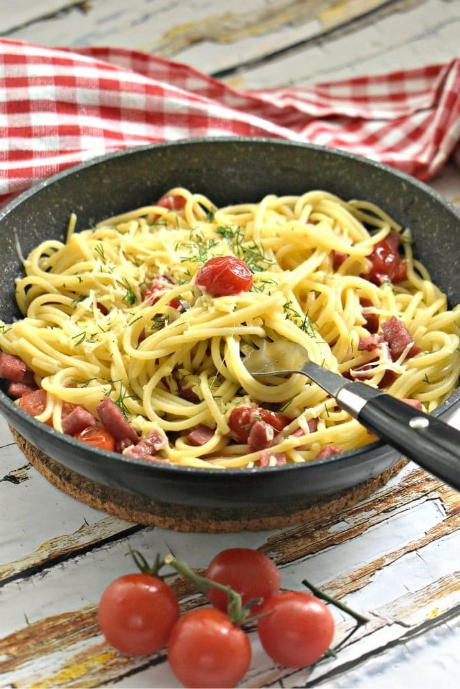 Сегодня мы предлагаем вам рецепт спагетти с колбасой, помидорами черри и сыром. Это настоящая классика, которую вы сможете приготовить быстро и легко. Вкус этого блюда вас приятно удивит: насыщенный аромат колбасы, сочные помидоры и нежное сочетание сыра с пастой — всё это создаст незабываемый вкусовой опыт для вас и ваших близких.