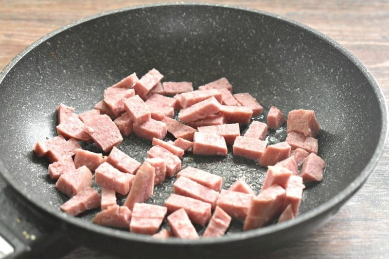 Параллельно разогреваем на сковороде оливковое масло. Копченую колбасу нарезаем брусочками, выкладываем в масло. Обжариваем 3 минуты, периодически перемешивая.