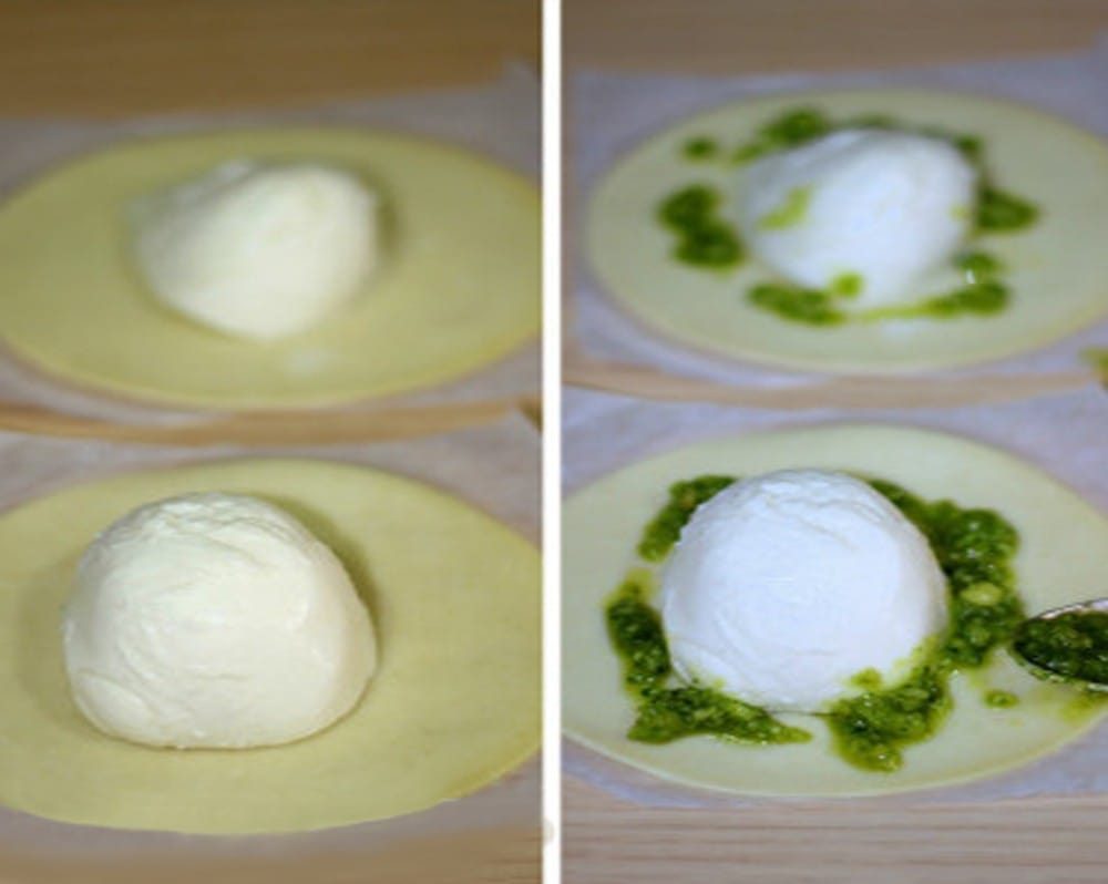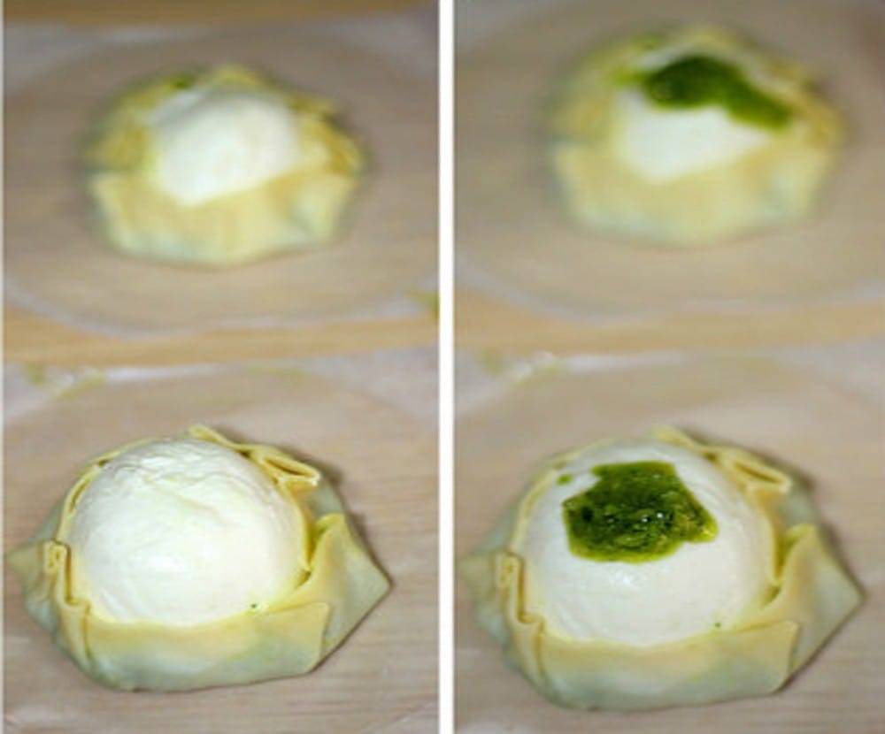 На каждую заготовку кладем по половине шарика сыра моцарелла. Добавляем чайную ложку соуса песто, намазываем вокруг сыра. Затем поднимаем тесто кверху, чтобы получилась тарталетка.