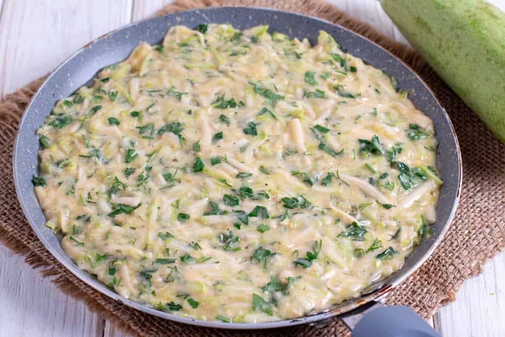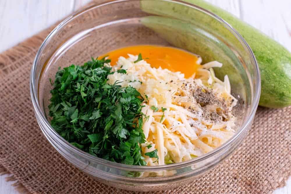 | 4 | Смешать в чаше тертые кабачки, сыр, яйца, чеснок, выдавленный через чеснокодавку, соль, черный молотый перец, рубленную зелень. |