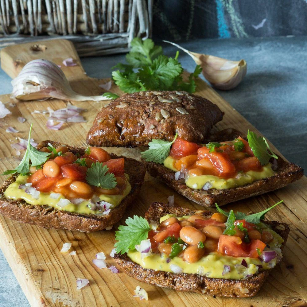 - Выложите на тосты пасту из авокадо, присыпьте красным луком, сверху дополните томатно-фасолевой смесью, украсьте листиками кинзы и подавайте в качестве закуски.