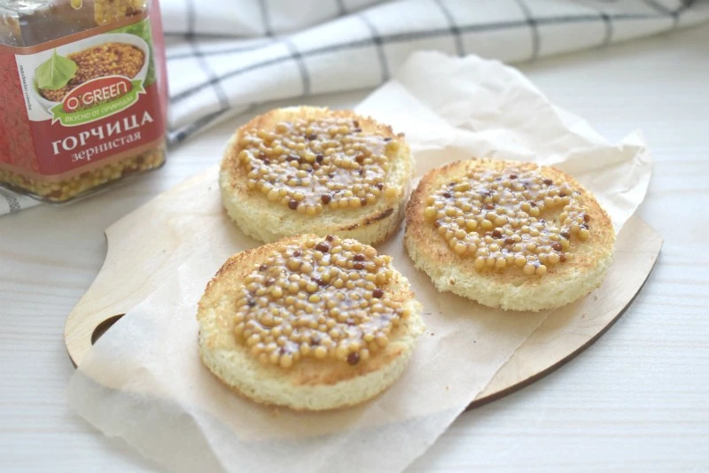 Заготовки для бутербродов смазываем горчицей в зёрнах. Распределяем продукт по хлебу тонким слоем.